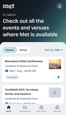 Nothing is pre-arranged. Met works in real-time, only in specific locations, allowing you to make meaningful connections as opportunities arise. Beyond events, you can also use Met to connect with people at coworking spaces, cafes, or airport lounges, helping you build both professional and social relationships in the spaces you frequent.