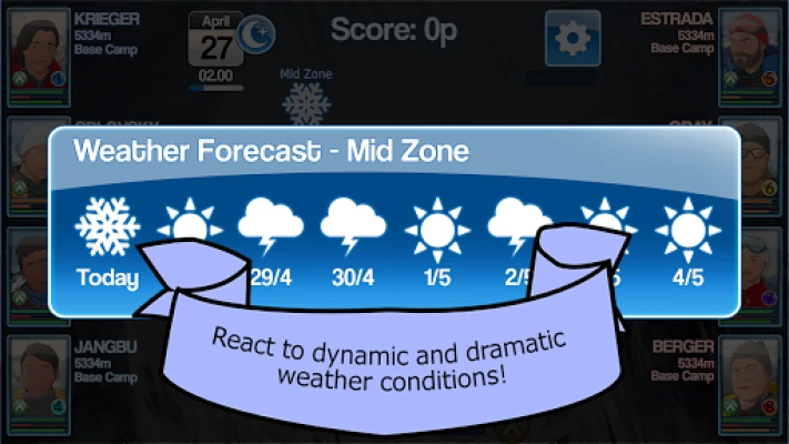 Battle the cold, the thin atmosphere, the wind and the snow! Do your best to avoid debilitating medical conditions! React to dramatic and dynamic weather conditions! Stay alive in the death zone!