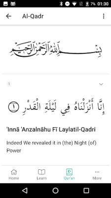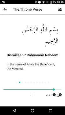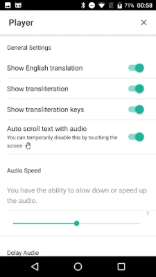 - You have the ability to slow down speed up the audio - You can delay the audio between each ayah - You can enjoy auto scroll of text when a new ayah starts - You can also repeat an ayah to help with memorisation - Bookmark chapters (surah) and verses (ayah) - Jump to an ayah in a surah