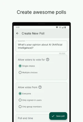 • Create polls that allow votes for single choice or multiple choices