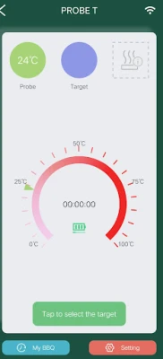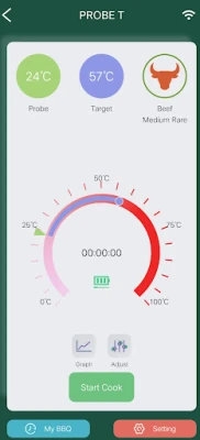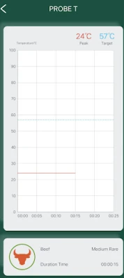 3.Time monitoring function, when the PROBE T APP cooking setting is completed, click start, it will automatically enter the timing state, and calculate the total time taken from the current temperature to the set temperature alarm.