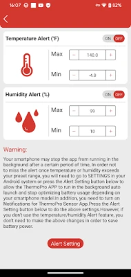 The ThermoPro Sensor APP is designed to receive the temperature and humidity values measured by thermometers made by industry leader ThermoPro. The APP displays real time temperature, humidity and heat index. Additionally it will provide historic data up to one year. An alarm function to alert you when the temperature or humidity is out of the set range.