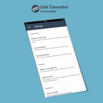 Tailor the app to your preferences with customizable settings. Choose your default units for various categories, ensuring that your most frequently used conversions are readily available for quick access.